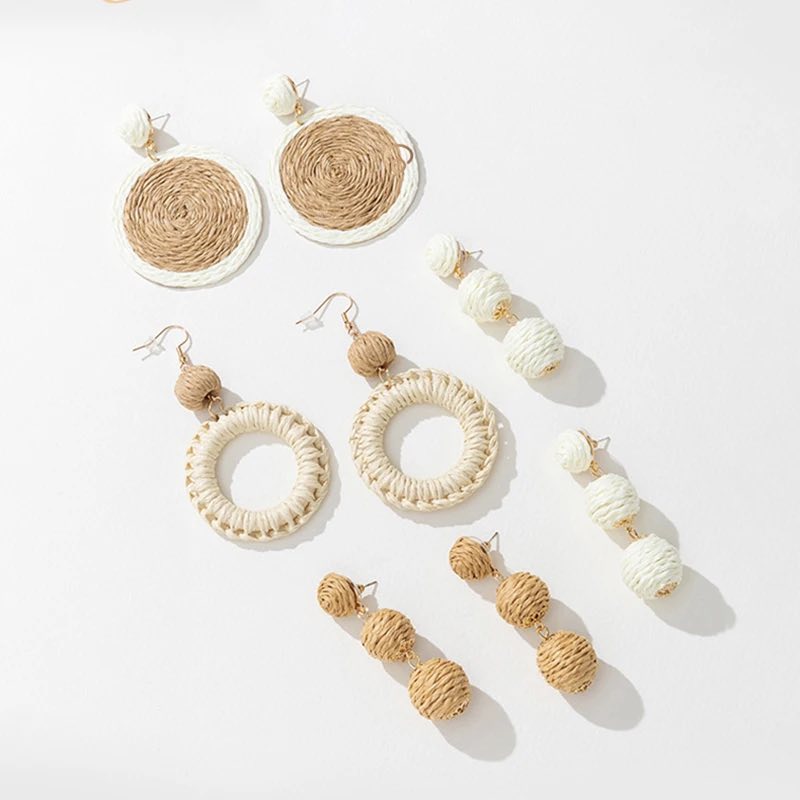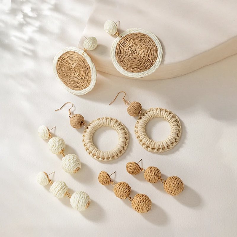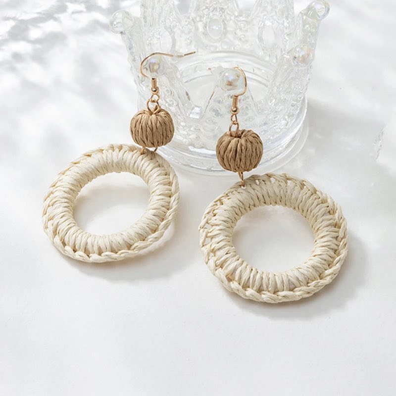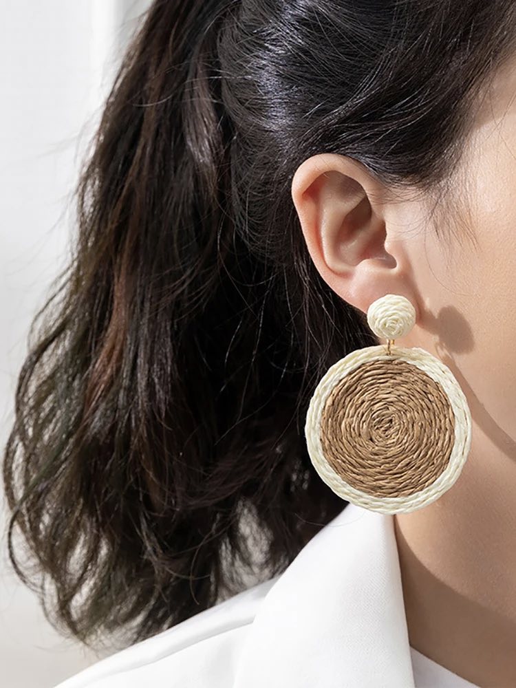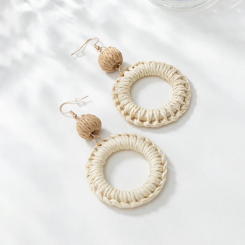 Verleihe deinem Outfit erdige Eleganz und bohemian Freiheit mit den TerraKnot Boho Ohrringen. Handgeflochten aus Raffia und Rattan in warmen Weiß- und Brauntönen, begeistern diese leichten Ohrringe durch ihr zeitloses, geometrisches Rund-Design – perfekt für sommerliche Leichtigkeit und Alltagsstil.